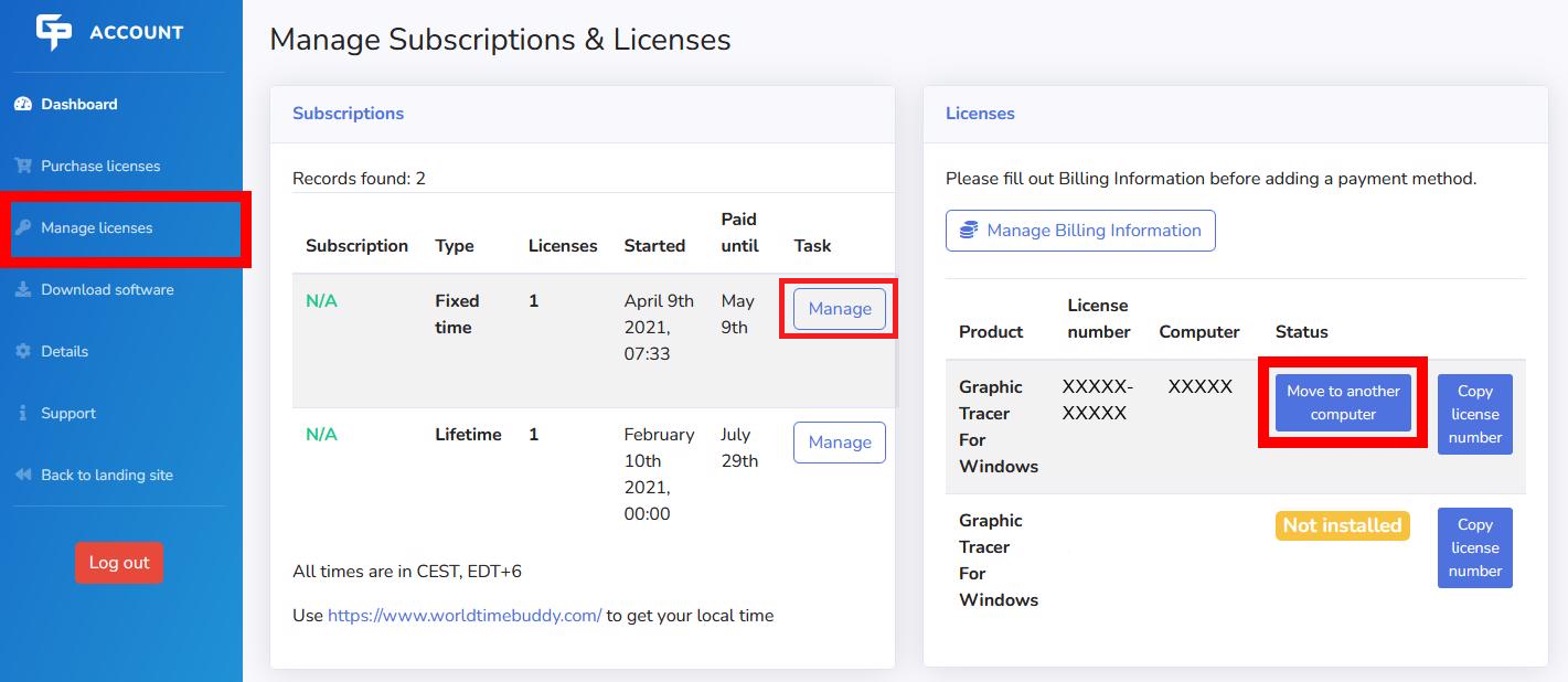 Login to your account and click "My licenses" in the menu to the left. Then click "Move to another computer" button for the license you want to move. You can now install or run the program on another machine and start using it. Your Graphic Tracer license then becomes locked to the new computer until you press the "Move to another computer" again.