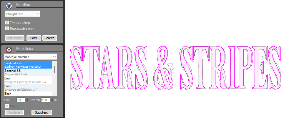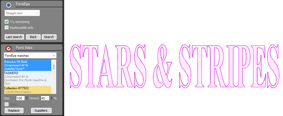 However if none of them look correct, you can do a new search with the 'Try stretching' option checked. This way, you can identify the font even if the designer has stretched or compressed the text you are working with. If you check the 'Replaceable only' option, the program will only search through fonts that you own, vector shapes and free to use fonts.